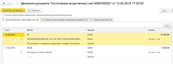 После проведения документ формирует проводки на сумму поступления денежных средств на наш расчётный счёт и на сумму банковских услуг (рис.6).