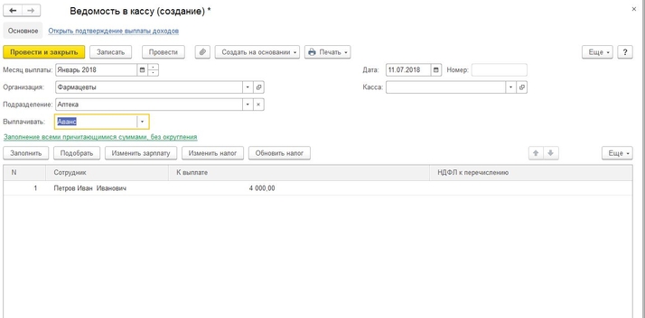 Первый способ — расчёт фиксированной суммой. Для расчёта аванса этим способом необходимо в документе «Приём на работу» на закладке «Оплата труда» указать соответствующий способ расчёта и фиксированную сумму аванса. В данном случае создаётся документ «Ведомость» с видом «Аванс». Она заполняется автоматически теми суммами, которые заданы в «Приёме на работу».
