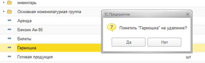 В 1С выйдет информационное окно, которое уточнит, действительно ли мы хотим пометить на удаление объект. После согласия в журнале мы видим пометку «X», это означает, что можно переходить ко второму этапу нашей операции.