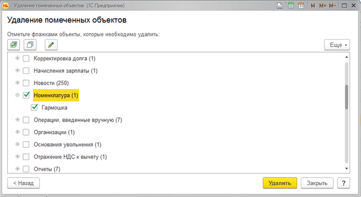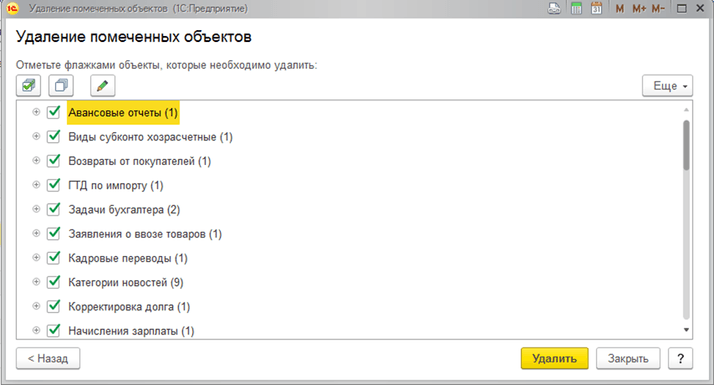Программа предложит нам на выбор 2 пути — автоматически удалить все объекты или выборочно. При выборе первого способа, автоматического удаления, удалятся все помеченные на удаление объекты. Не всегда этот вариант удобен для пользователей 1С. Поэтому подробнее рассмотрим вариант, когда можно удалить объекты на свой выбор.
