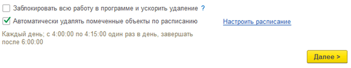 Для настройки перейдём в «Администрирование» → «Удаление помеченных объектов». Нужно установить флажок «Автоматически удалять помеченные объекты по расписанию». Можно установить своё расписание, а можно оставить настройки, установленные по умолчанию. В этом случае удаление помеченных «крестиком» объектов будет осуществляться в ночное время, когда в программе отсутствует активность.