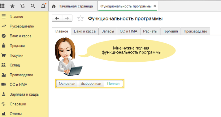 Для того чтобы мы могли создавать документ «Корректировка долга» в «С:Бухгалтерия 8», проверим функциональность программы в разделе «Главное». Она должна быть полной (рис. 1).