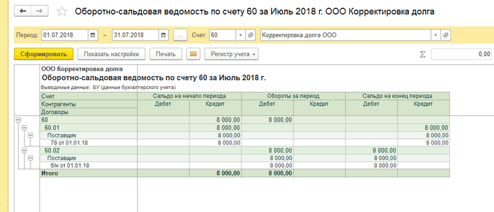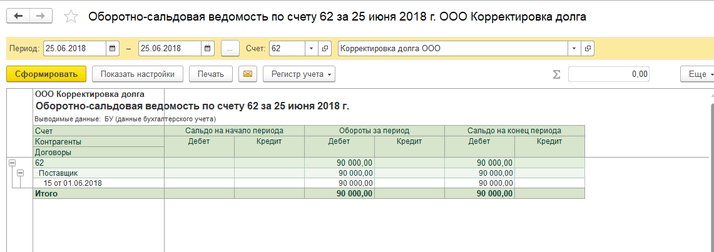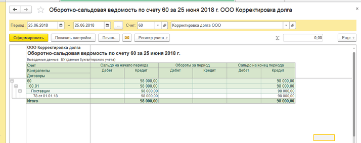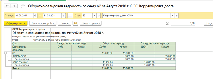 В таком случае мы без проблем сможем провести взаимозачёт с помощью документа «Корректировка долга». Для начала нужно будет сформировать оборотно-сальдовую ведомость по счетам 62 и 60 в разрезе конкретного контрагента (нашего партнёра), чтобы убедиться – на конкретную дату проведения взаимозачёта (дату создания документа «Корректировка долга») имеется остаток (рис. 2, 3).