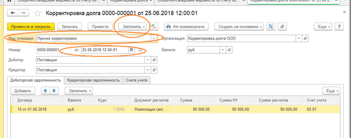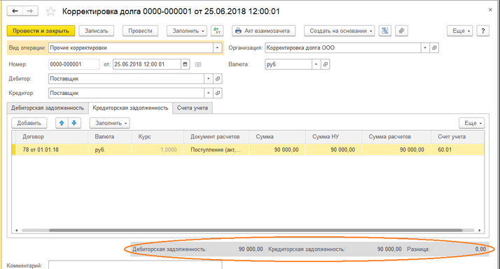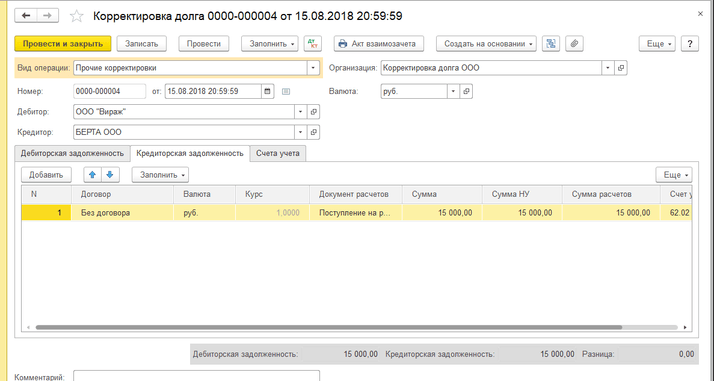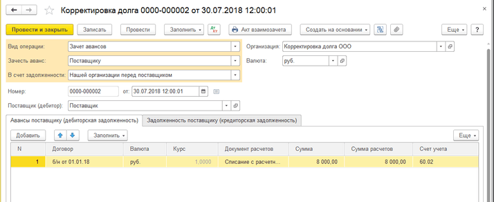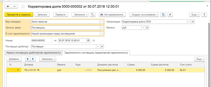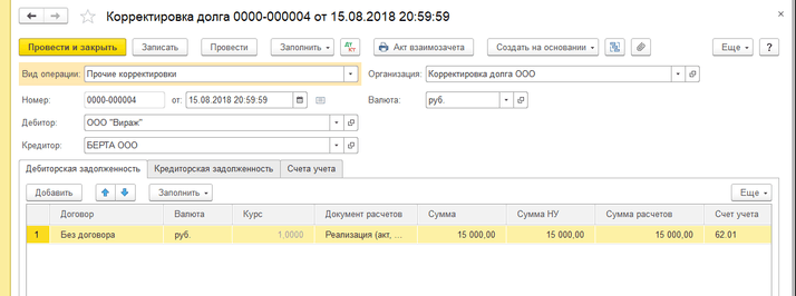 Дебитором и кредитором будет одно и то же лицо. По кнопке «Заполнить» автоматически заполняем документ. Дебиторская и кредиторская задолженности не всегда могут быть равны, поэтому нам нужно будет скорректировать сумму вручную в сторону уменьшения. Закладку «Счета учёта» заполнять не нужно. Результат проведения документа – закрытый остаток по счёту 62 и оставшаяся часть суммы задолженности нашему партнёру.