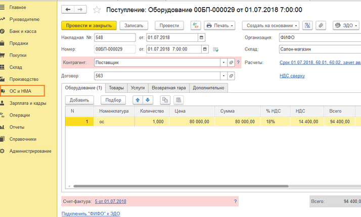 Для того чтобы отразить факт поступления ОС в организацию, нужно сделать документ «Поступление оборудования» в разделе «ОС и НМА» (рис. 1).