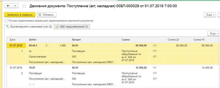 В нашем примере сумма НДС не включается в стоимость оборудования, она выделяется на отдельном счёте 19.01. Если потребуется всё-таки включить сумму НДС в первоначальную стоимость объекта, то в документе нужно перейти по ссылке «НДС» и включить галочку «НДС включать в стоимость». В таком случае будет дана одна проводка по оприходованнию объекта на счёт 08 «Вложения во внеоборотные активы».