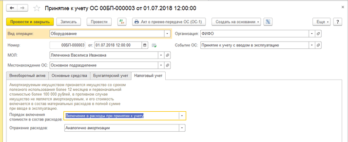 На закладке «Налоговый учёт» (рис. 6) программа даёт нам подсказку о том, что оборудование будет признано основным средством в том случае, если его первоначальная стоимость будет выше 100 000 рублей, а также срок его эксплуатации будет превышать 12 месяцев. В нашем примере имущество не является амортизируемым, его первоначальная стоимость будет единовременно включена в расходы в момент принятия объекта к учёту, о чём свидетельствует проводка, указанная на рис. 7.