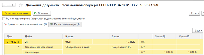 Проводкой Д01.01 К08.04.1 основное средство будет принято к учёту и введено в эксплуатацию. Амортизация по объекту ОС будет начисляться автоматически регламентной операцией в «Закрытии месяца» (со следующего за вводом в эксплуатацию месяца) (рис. 8).