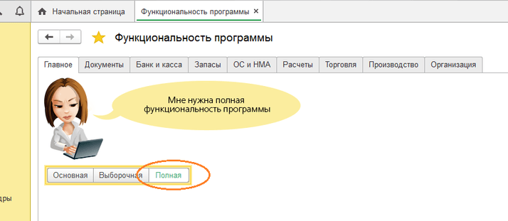 Для начала пользователю рекомендуется настроить функциональность своей программы, то есть обозначить тот набор опций и возможностей, которые он хотел бы использовать в своей работе. Указывайте полную функциональность программы, чтобы в дальнейшем не возникло проблем с настройкой определённого раздела учёта (рис. 1).