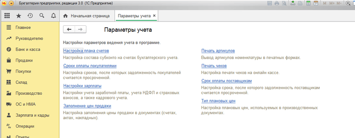 Все необходимые первоначальные настройки, на которые пользователю рекомендуется обратить внимание, находятся в одном месте: в разделе «Администрирование» – «Параметры учёта». В восемь подразделов скооперированы настройки учёта (рис. 2).