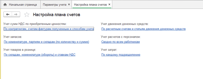Эта группа отвечает за управление субконто на счетах учёта НДС, запасов, товаров в рознице, денежных средств, расчётов с персоналом и затрат. Данная аналитика нужна для анализа и контроля движений по счетам в таких бухгалтерских отчётах, как «Оборотно-сальдовая ведомость», «Анализ счёта», «Карточка счёта» и т. д.
