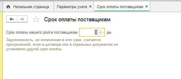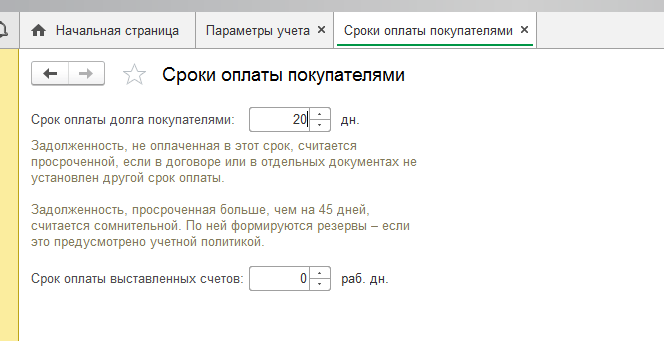 Необходимая настройка для тех компаний, которые планируют формировать резервы по сомнительным долгам. По истечении указанного срока оплаты и будет начисляться резерв (при условии, что в договоре с контрагентом не указан иной срок оплаты).
