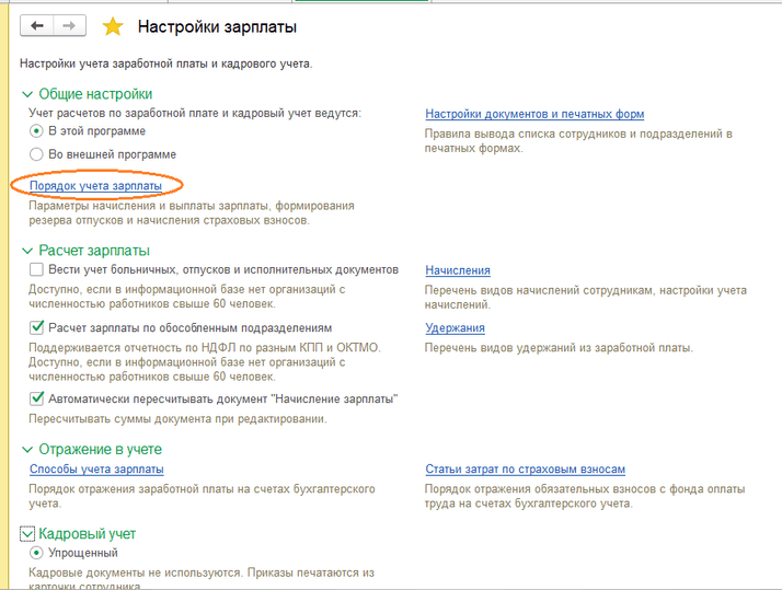 Перейдя по ссылке «Порядок учёта зарплаты», вы также сможете настроить учёт резерва отпусков.