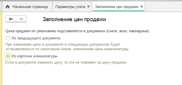 - В группе «Заполнение цен продажи» (рис. 6) установите предпочитаемый вариант заполнения цен в документе «Реализация товара/услуги».