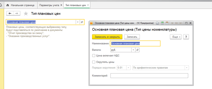 - Если вы являетесь производственным предприятием, в группе «Тип плановых цен» укажите тот, цены из которого будут автоматически подставляться в документы (рис. 10).