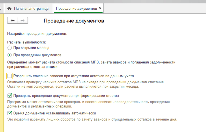 Далее пользователь самостоятельно решает, устанавливать ли флажок на закладке «Разрешить списание запасов при отсутствии остатков по данным учёта». Если он не установлен, то при проведении документов с участием товарно-материальных ценностей программа проверяет наличие остатков на складе. И если их не обнаруживает, документ на выбытие ТМЦ не проводится.