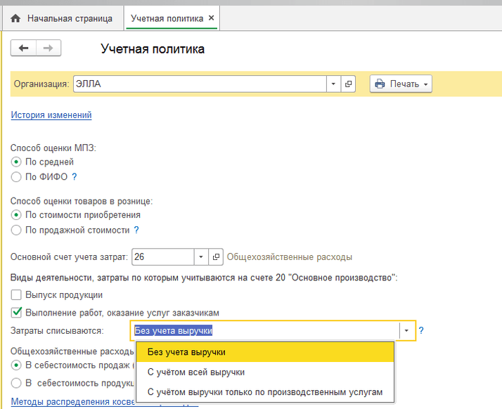 Если вы хотите использовать 20-й счёт, то установите галочку «Выпуск продукции» или «Выполнение работ, оказание услуг заказчикам». Можно сразу обе. Здесь же вы должны указать способ списания затрат со счёта 20. Если мы видим настроенный способ списания затрат «С учётом всей выручки», то при закрытии 20-счёта в конце месяца программа 1С будет сравнивать наличие оборотов с одинаковым номенклатурными группами по счетам 20.01 «Основное производство» и 90.01.1 «Выручка по деятельности с основной системой налогообложения». Если установлен способ списания затрат со счёта 20 «С учётом выручки только по производственным услугам», то для закрытия 20-го счёта необходимо наличие документа «Оказание производственных услуг» (не путать с документом «Реализация услуги»!).