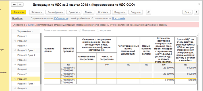 Рассмотрим первую ситуацию, когда в отчётности за прошлый налоговый период (второй квартал 2018 года) мы ошибочно задублировали в книге покупок сумму покупки и приняли к вычету лишнее (рис.1). Ошибку обнаружили поздно, декларация была уже сдана.