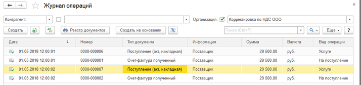 Итак, в 1С:Бухгалтерия 8 ред. 3.0. мы имеем два одинаковых документа «Поступление услуги» с зарегистрированными счетами-фактурами второго квартала (рис. 2).
