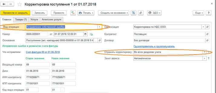 А также зарегистрировать счёт-фактуру на закладке «Главное». Если ошибка была допущена в реквизитах счёта-фактуры, она исправляется таким же образом: правильные данные должны быть указаны в реквизитах колонки «Новое значение». При этом закладки «Товары» или «Услуги» остаются нетронутыми.