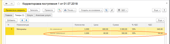Табличная часть, в которой мы отражаем движения по покупным товарам и услугам, будет заполнена автоматически. В строке «После изменения» не забудьте указать новые данные по цене и количеству товаров или другую ставку НДС (рис. 6).