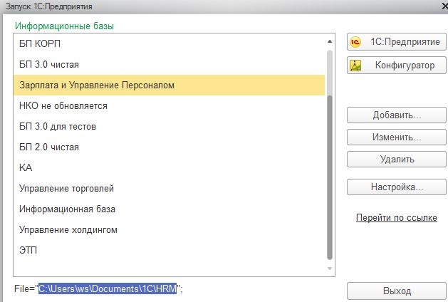 Чтобы узнать путь, где хранится база, смотрим его при запуске ярлыка 1С (см. скриншот). Выбираем базу, с которой настраиваем обмен, снизу видим этот самый путь к нашей базе. Копируем путь без кавычек и вставляем в окно, где ведём настройку синхронизации.