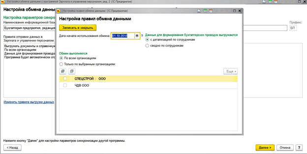 Нажимаем «Далее». Программа выведет список организаций, по которым планируется выполнять обмен в бухгалтерию.