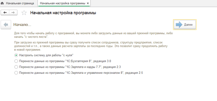 Допустим, вы приобрели новую программу 1С:Зарплата и управление персоналом 8 ред. 3.1 и хотите начать работать. Куда зайти, что открыть в незнакомом интерфейсе? В этом поможет сориентироваться «Помощник начальной настройки», который открывается при запуске новой программы (рис. 1). Он предложит выбор одного из нескольких вариантов для начала работы: начать работу с нуля либо перенести данные из программ, в которых вели учёт зарплаты до момента перехода. В этой статье мы обсудим первый вариант начала работы и подробно рассмотрим основные настройки программы.