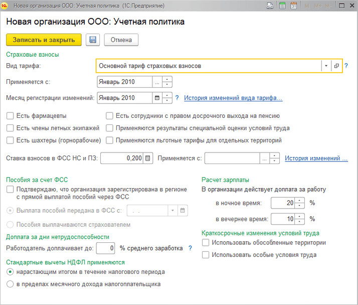 Перед началом работы в программе заполняем сведения об организации. В разделе «Настройка» – «Реквизиты организации» вносим основные реквизиты, коды и фонды, информацию о том, есть ли у организации обособленные подразделения. Важно заполнить сведения об учётной политике, определяющие основные правила ведения учёта организации. Сделаем это в подразделе «Учётная политика и другие настройки» (рис. 2). Здесь указываем тариф страховых взносов, ставку взносов от НС и ПЗ, размер доплаты за работу в вечернее и ночное время, заполняем сведения об ответственных лицах организации. В учётной политике организации задаём правила расчёта аванса и выплаты зарплаты, способ отражения зарплаты в бухгалтерском учёте. Если в организации формируются оценочные обязательства (резервы отпусков), устанавливаем соответствующие галочки, выбираем метод расчёта.