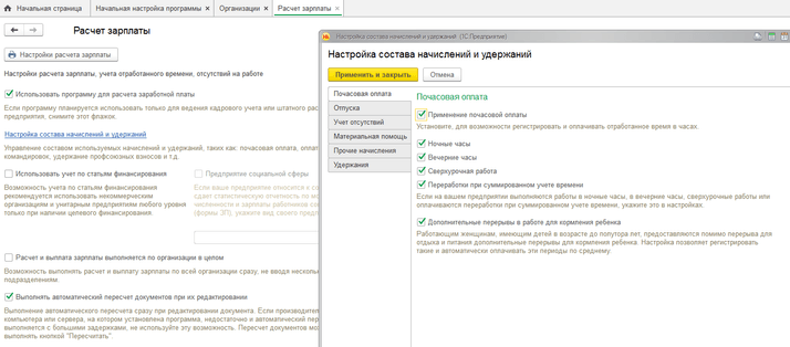 Небольшое резюме. В разделе «Настройка» расположены основные настройки зарплаты и кадрового учёта, которые предлагает «Помощник начальной настройки программы». Но есть некоторые функции/параметры, которые можно открыть только через помощника. Эти настройки касаются премий, ежемесячной и квартальной, годовой и разовой, вариантов их начисления; материальной помощи и единовременной выплаты к отпуску (они предоставляются в размере кратном окладу, мы задаём количество окладов) и некоторые другие интересные параметры.