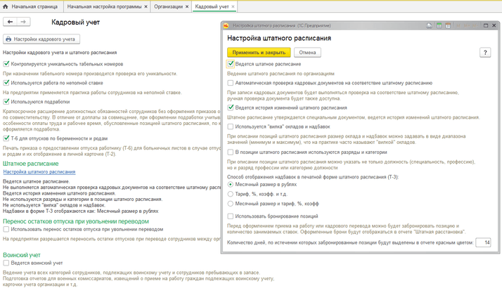 Все основные настройки, касающиеся начисления зарплаты и кадров, собраны в разделе «Настройка» – «Расчёт зарплаты» и «Кадровый учёт». Эти настройки регулируют наполнение разделов программы документами и отчётами.