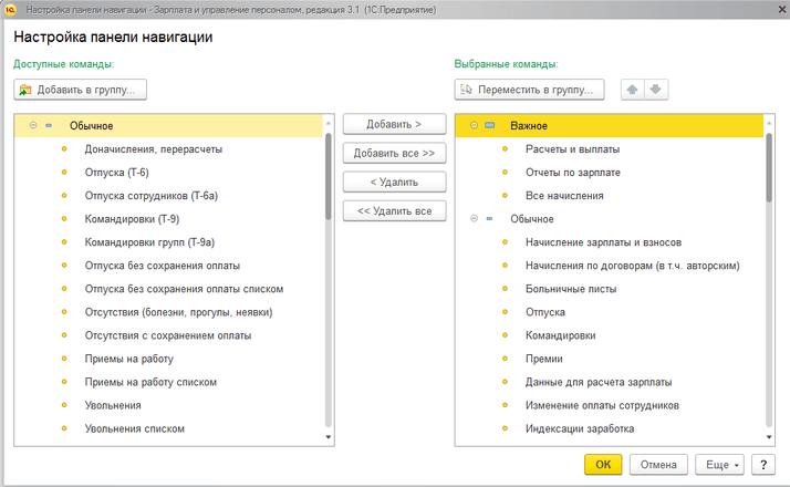 Если мы включили нужную настройку, а документ не отображается в составе раздела, воспользуйтесь функцией настройки навигации и (или) настройки действий. Значок находится в верхнем правом углу каждого раздела. Перенося позиции из раздела «Доступные команды» в «Выбранные команды», регулируем наполнение раздела (рис. 5).
