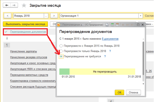 Например, бухгалтер исправил или перепровёл поступление денег на расчётный счёт, который фиксировал поступление аванса. В итоге нарушаются взаиморасчёты с контрагентом по данному договору, что может привести к неверному исчислению НДС. Или другая ситуация, когда срочно нужно закрыть периoд, а программа начинает требовать перепровести и закрыть предыдущие месяцы. Что делать в такой ситуации? Если мы уверены, что у нас в программе всё верно и нежелательно в данный момент перепроводить все документы, можно «обмануть» программу, заставив её думать, что прошлый период закрыт верно и перепроводить там ничего не нужно. Для этого в последних релизах 1С:Бухгалтерии 8 ред. 3.0 можно нажать на данную операцию и выбрать нужный вариант перепроведения: за весь предлагаемый период, только документы текущего месяца или вовсе ничего не перепроводить для ускорения процесса закрытия месяца (рис. 1).