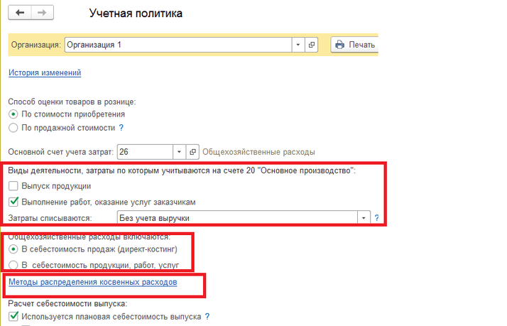 - Второй вариант – закрытие на себестоимость продукции. Если мы выбрали этот вариант, то обязательно установите правило, по которому суммы со счёта 26 будут распределяться между номенклатурными группами на счёте 20.01 по ссылке «Методы распределения косвенных расходов», иначе счёт 26 не закроется.