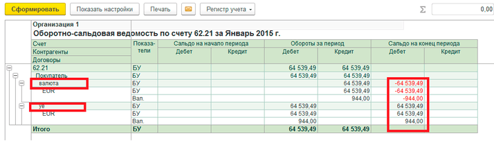 Эта операция необходима для составления квартальной декларации по НДС. «Формирование книги покупок и продаж» также можно запустить через «Помощника учёта НДС» или «Регламентные операции по НДС» в меню «Операции». Если организация ведёт расчёты в валюте, проводится регламентная операция по переоценке валютных средств, которая корректирует валютные остатки в соответствии с текущим курсом. При осуществлении этой операции могут выходить огромные суммы по переоценке валюты, которой, как вам кажется, нет, и расчёты уже давно закрыты. В этой ситуации главное не паниковать, а спокойно разобраться. Для этого сформируем ОСВ по счёту, который программа переоценивает в разрезе всех субконто: валюта, договор и документы расчётов. Чаще всего получается так, что валюта закрылась по другому договору, поэтому висит остаток с плюсом и минусом на каждом из них, который мы не видим в общей ОСВ. Для исправления достаточно перевыбрать нужный договор и перепровести операцию по переоценке (рис. 3).