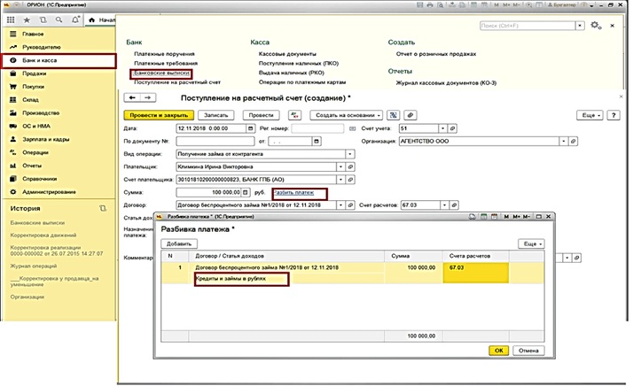 Денежную сумму учредитель может перечислить либо на расчётный счёт, либо внести наличные в кассу по ПКО, в которой указываем основание внесения денежной суммы по договору займа. Если происходит перечисление на расчётный счёт, то в 1С зайдём в раздел «Банк и касса» – «Банк» – «Банковские выписки», кнопка «Поступление» – «Поступление на расчётный счёт». В графе «Вид операции» выбираем «Получение займа от контрагента» (рис. 1).