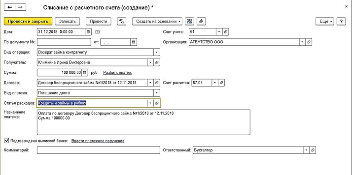 Чтобы вернуть заём, создаём «Платёжное поручение», где выбираем вид операции «Возврат займа контрагенту». После того как мы получили выписку из банка, где мы увидим списание денежных средств с расчётного счёта, подтверждаем ранее созданный документ «Списание с расчётного счёта», для того чтобы сформировались проводки (рис. 2).