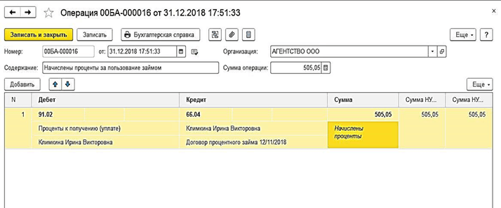 Проценты, которые получит учредитель, являются его доходом, поэтому фирма-заёмщик выступает как налоговый агент и обязана исчислить, удержать и уплатить сумму НДФЛ. Создаём документ «Операции, введённые вручную» (рис. 4).