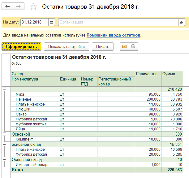 Кроме того, можно сформировать оборотно-сальдовую ведомость с нужными настройками. С помощью этих отчётов можно проверить правильность заполнения документов, то есть верно ли были выбраны склады, те ли товары, чтобы не было по одному товару положительных и отрицательных остатков. В оборотно-сальдовой ведомости есть возможность перейти в ранее созданные документы и исправить ошибки в случае их обнаружения.