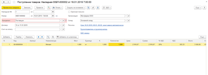 Заключительной операцией в покупке материала станет «Счёт-фактура полученный».
