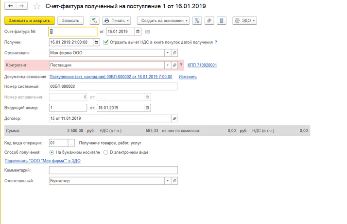 - По ссылке открываем документ «Счёт-фактура полученный». Далее необходимо проверить на правильность заполнение полей документа.