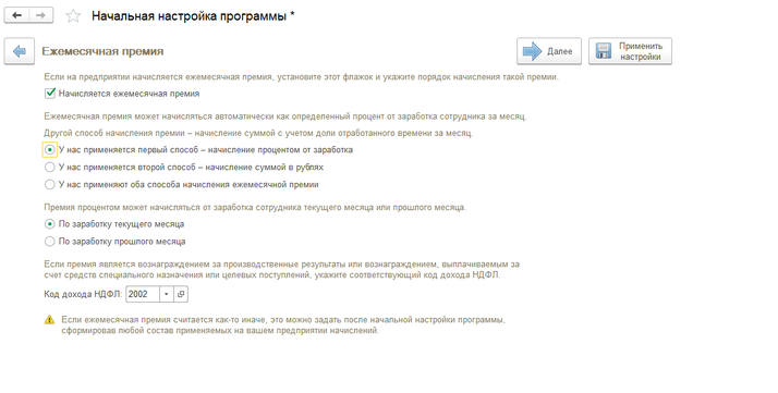 В программе есть начальная настройка программы. Её можно найти через «Главное меню», перейти во «Все функции», а если их нет, то нужно зайти в «Сервис», далее в «Параметры» и проставить галку на «Отображать команду Все функции». Затем выбрать «Обработки» и найти там «Начальная настройка программы». При нажатии на кнопку «Далее» на одной из страниц будет «Ежемесячная премия». После выполнения настроек в программе в списке «Начисления» уже появится данная премия, которую остаётся только проверить и при необходимости изменить формулу расчёта. Также в разделе «Зарплата» можно будет уже увидеть отдельно «Премия». Данную настройку можно увидеть на рис. 1.