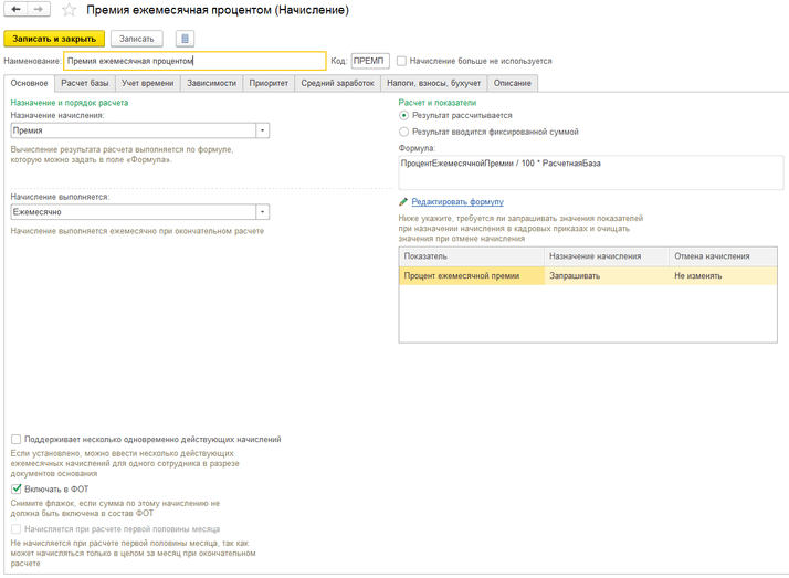Мы рассмотрим создание нового начисления. Первым заполняем «Наименование», в нашем случае это «Премия ежемесячная процентом». Код, окно которого будет правее, прописывается так, чтобы он был уникальным. Далее на закладке «Основное» нужно указать назначение начисления «Премия» и начисление выполняется «Ежемесячно». Важно, что если там будет указано «По отдельному документу», то это будет выполняться не в документе «Начисление зарплаты и взносов», а в отдельном документе «Премия». Затем внизу окна проставляем галки на «Включать в ФОТ» и, если она начисляется при расчёте зарплаты за первую половину месяца, галку ставим и туда. После этого нужно прописать формулу, по которой будет рассчитываться данное начисление. К премии процентом рекомендуется указывать формулу [ПроцентЕжемесячнойПремии / 100 * РасчётнаяБаза], а все эти показатели можно найти в списке. (Рис. 2).