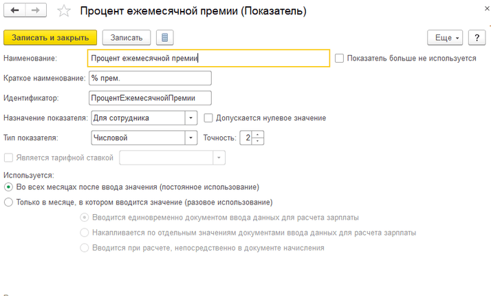 Если в списке показателей отсутствует «ПроцентЕжемесячнойПремии», то его необходимо создать. Настройки по этому показателю можно увидеть на рис. 3.