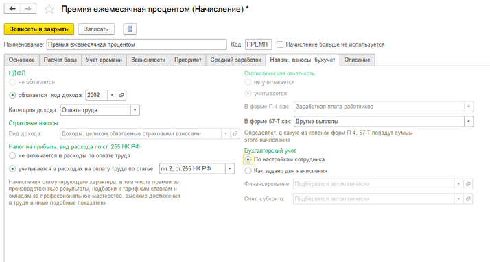 «Налоги, взносы, бухучёт» заполняется настройками по НДФЛ, по страховым взносам и включению в расходы. Здесь будет доступен налог на доходы, его код и категория, также включение в налог на прибыль. Код дохода указывается 2002, в котором проставляется галка «Соответствует оплате труда», чтобы была возможность выбрать категорию «Оплата труда». Ещё будет активным окно по включению в Т-57 и отражению в бухгалтерском учёте: «По настройкам сотрудника» и «Как задано для начисления». На рис. 4 отражены все настройки по данной вкладке.