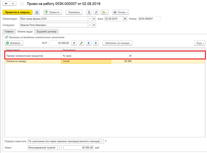 При таких настройках премия будет указываться в документе «Приём на работу» или «Кадровый перевод». На рис. 5 она указана в приёме процентом от оклада.