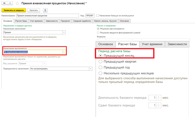 Как было написано выше, есть ещё возможность начислять премию отдельным документом. Поэтому настройки в самом начислении немного поменяются. А именно: на вкладке «Основное» начисление будет выполняться по отдельному документу, а в «Расчёт базы» будет возможность указывать только предыдущие периоды. Это можно увидеть на рис. 7.