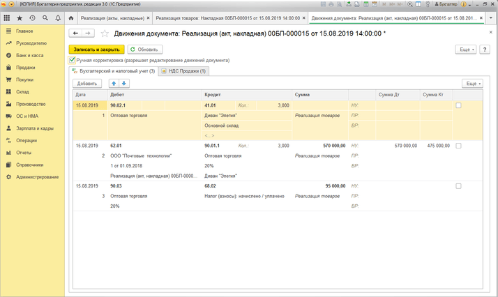 Рассматривая ситуацию добавления собственной проводки в проведённом документе через ручное редактирование, хочу отметить, что данная корректировка необходима для бухгалтера, чтобы, не создавая отдельную ручную операцию, бухгалтер мог через ручное редактирование проведённого документа как добавить нужную проводку, так и удалить ненужные проводки.