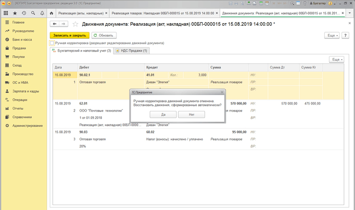 Если возникнет необходимость вернуть документу прежние проводки, нужно снова зайти во вкладку Движения документа и убрать галочку Ручная корректировка. В связи с этим программа вас предупредит о том, что все ваши ручные корректировки будут отменены, и документ будет перепроведён, сформировав стандартные проводки (рис. 4).