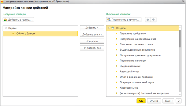 В открытом окне «Настройка панелей действий» функция «Обмен с банком» переносится по кнопке «Добавить» в правую часть (доступные команды для пользователя).